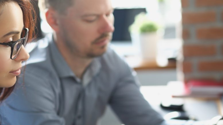 Portrait of male colleague help female coworker with work, explain on laptop, office life, corporation, business, education, teamwork, progress concept